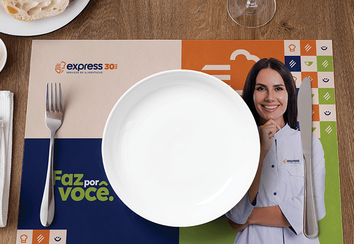 Para marcar essa nova fase, criamos o selo comemorativo de 30 anos, alinhamos o discurso institucional e lançamos a campanha que destaca o novo posicionamento e a identidade renovada da Express. Também desenvolvemos um manifesto que reforça o compromisso da marca: ser mais que uma fornecedora de refeições, atuando como extensão do cuidado e do sucesso de cada cliente.