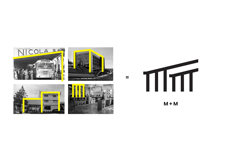 O símbolo criado é composto por dois “M”, iniciais de "Memória" e "Marcopolo", que se sobrepõem como estruturas arquitetônicas — um telhado dentro do outro — representando proteção, continuidade e cuidado com o passado. A forma dialoga com a arquitetura do espaço físico do acervo e com os traços da identidade da própria Marcopolo, fortalecendo a conexão entre marca e história.